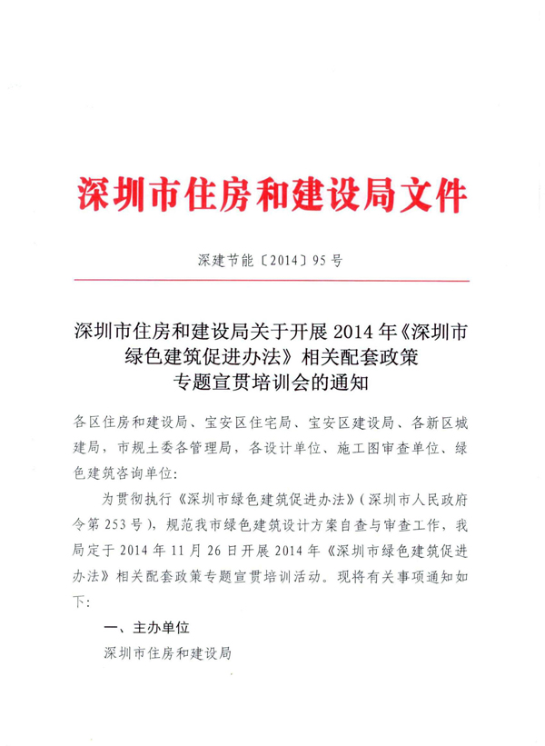 深圳市住房和建設(shè)局關(guān)于開展2014《深圳市綠色建筑促進辦法》相關(guān)配套政策專題宣貫培訓會的通知