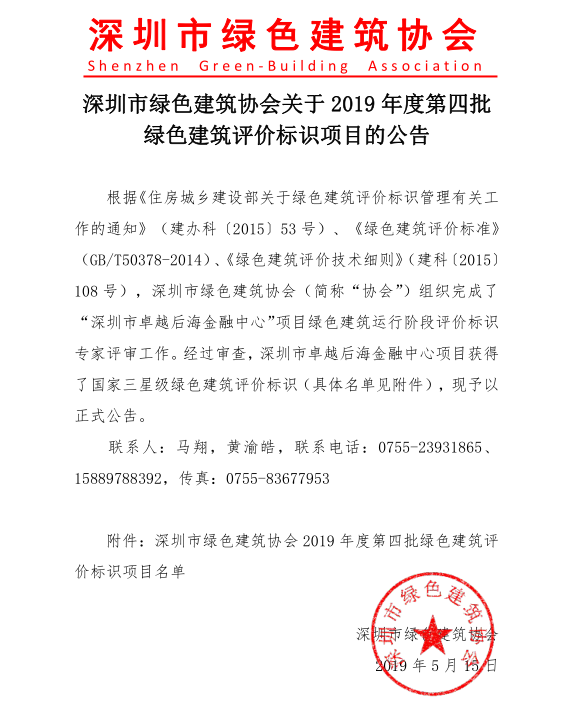 深圳市綠色建筑協(xié)會關(guān)于2019年度第四批綠色建筑評價標(biāo)識項目的公告