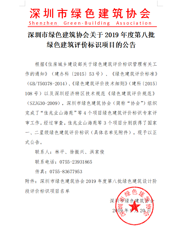 深圳市綠色建筑協(xié)會關(guān)于2019年度第八批綠色建筑評價(jià)標(biāo)識項(xiàng)目的公告