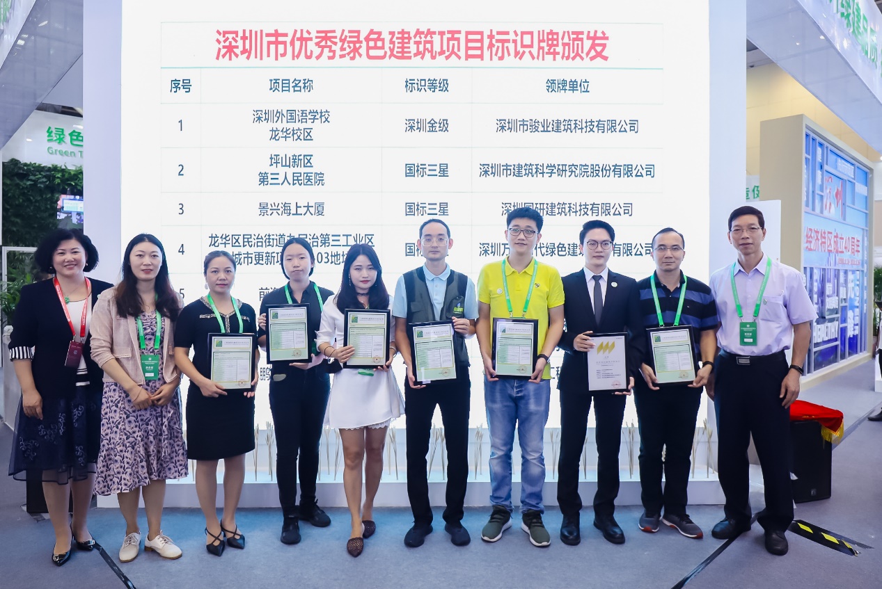 現(xiàn)場(chǎng)還為深圳外國(guó)語(yǔ)學(xué)校龍華校區(qū)、坪山新區(qū)第三人民醫(yī)院、景興海上大廈、龍華區(qū)民治街道辦民治第三工業(yè)區(qū)城市更新項(xiàng)目02-03地塊、前海控股大廈、前海周大福金融大廈、鵬鼎時(shí)代大廈等項(xiàng)目進(jìn)行了授牌,涵蓋了國(guó)標(biāo)設(shè)計(jì)三星、深圳金級(jí)、運(yùn)行標(biāo)識(shí)。