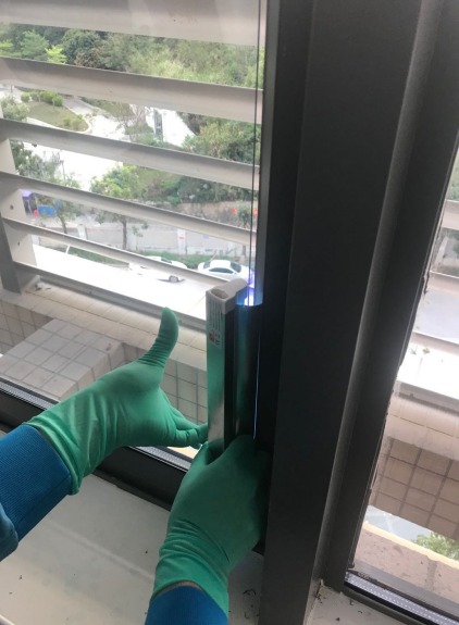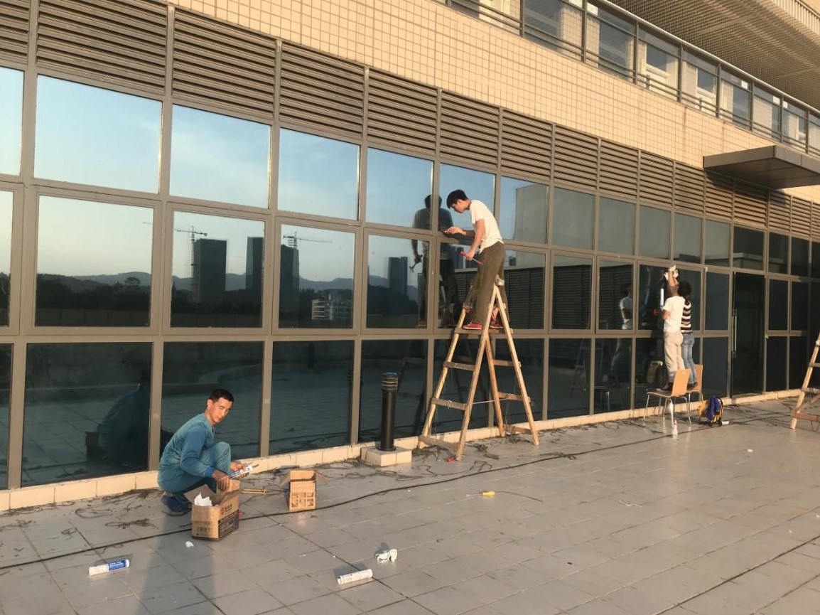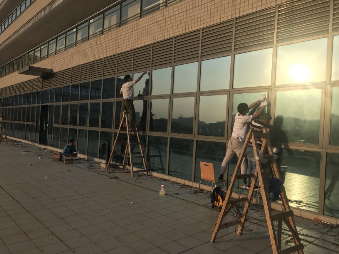 2.4月22日,完成剩余基面的清理工作,同時(shí)開始已完成清理工作的基面抗菌隔熱玻璃的黏貼工作。至下午六點(diǎn)半,剩余最上面一排玻璃未施工密封膠(約占40%)。