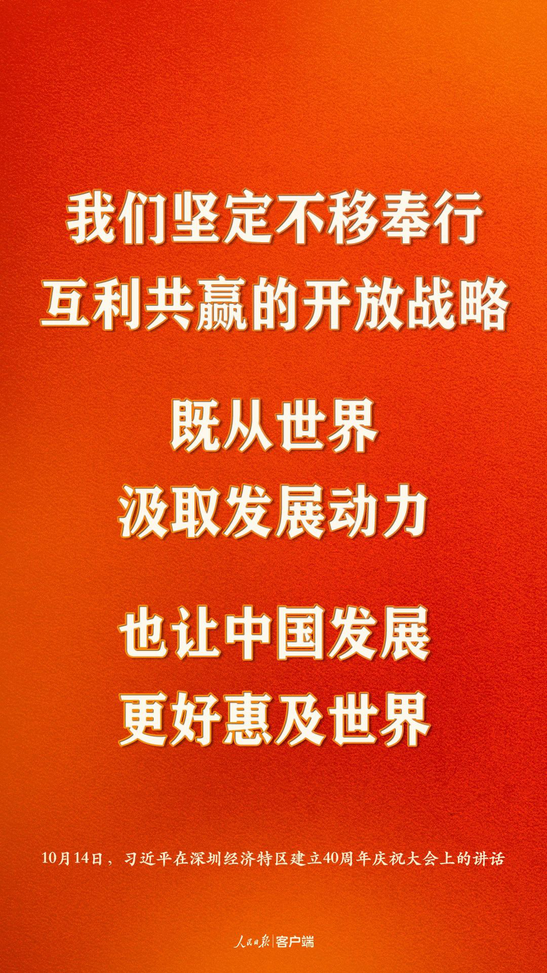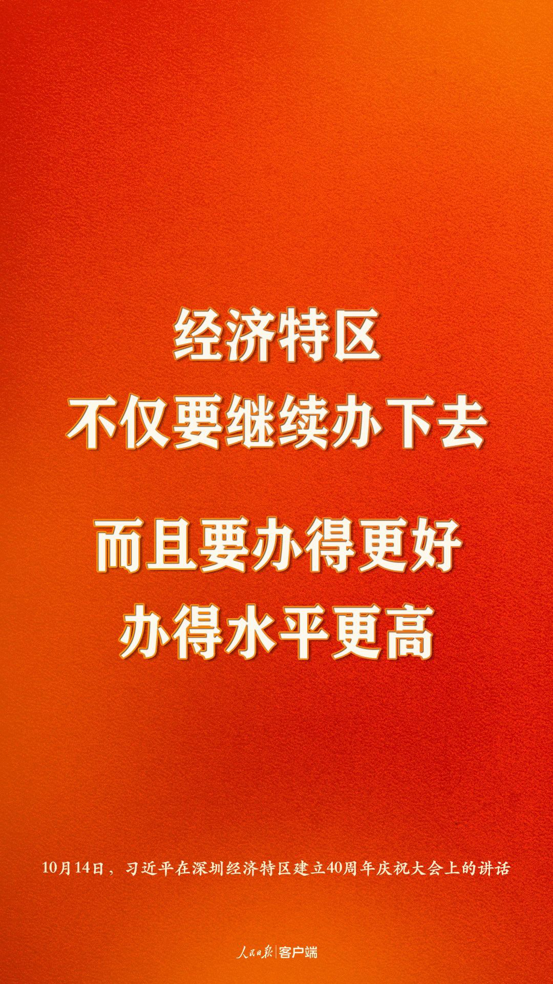 深圳經(jīng)濟(jì)特區(qū)建立40周年慶祝大會(huì)14日上午在廣東省深圳市隆重舉行。中共中央總書記、國(guó)家主席、中央軍委主席習(xí)近平在會(huì)上發(fā)表重要講話,強(qiáng)調(diào)要高舉中國(guó)特色社會(huì)主義偉大旗幟,統(tǒng)籌推進(jìn)“五位一體”總體布局,協(xié)調(diào)推進(jìn)“四個(gè)全面”戰(zhàn)略布局,從我國(guó)進(jìn)入新發(fā)展階段大局出發(fā),落實(shí)新發(fā)展理念,緊扣推動(dòng)高質(zhì)量發(fā)展、構(gòu)建新發(fā)展格局,以一往無前的奮斗姿態(tài)、風(fēng)雨無阻的精神狀態(tài),改革不停頓,開放不止步,在更高起點(diǎn)上推進(jìn)改革開放,推動(dòng)經(jīng)濟(jì)特區(qū)工作開創(chuàng)新局面,為全面建設(shè)社會(huì)主義現(xiàn)代化國(guó)家、實(shí)現(xiàn)第二個(gè)百年奮斗目標(biāo)作出新的更大的貢獻(xiàn)。