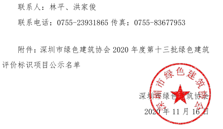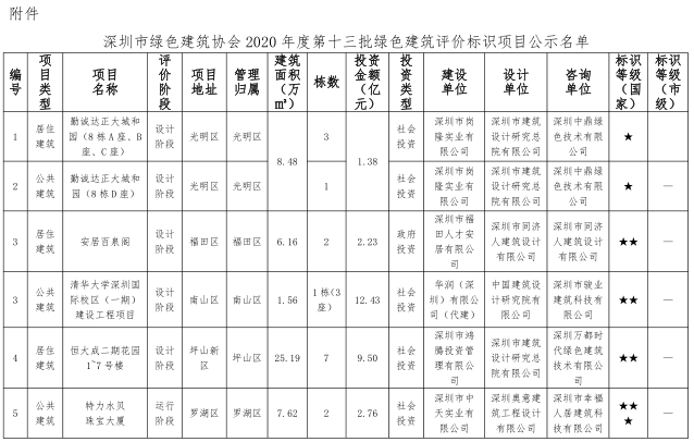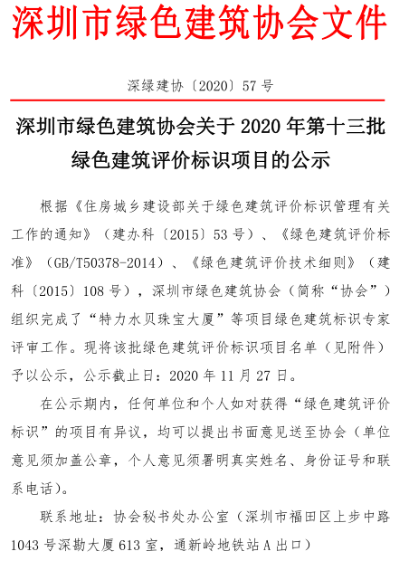 深圳市綠色建筑協(xié)會關(guān)于2020年度第十三批綠色建筑評價標(biāo)識項目的公示