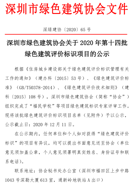 深圳市綠色建筑協(xié)會(huì)關(guān)于2020年度第十四批綠色建筑評(píng)價(jià)標(biāo)識(shí)項(xiàng)目的公示
