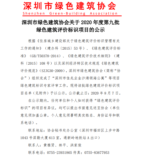 深圳市綠色建筑協(xié)會關于2020年度第九批綠色建筑設計階段評價標識項目的公示