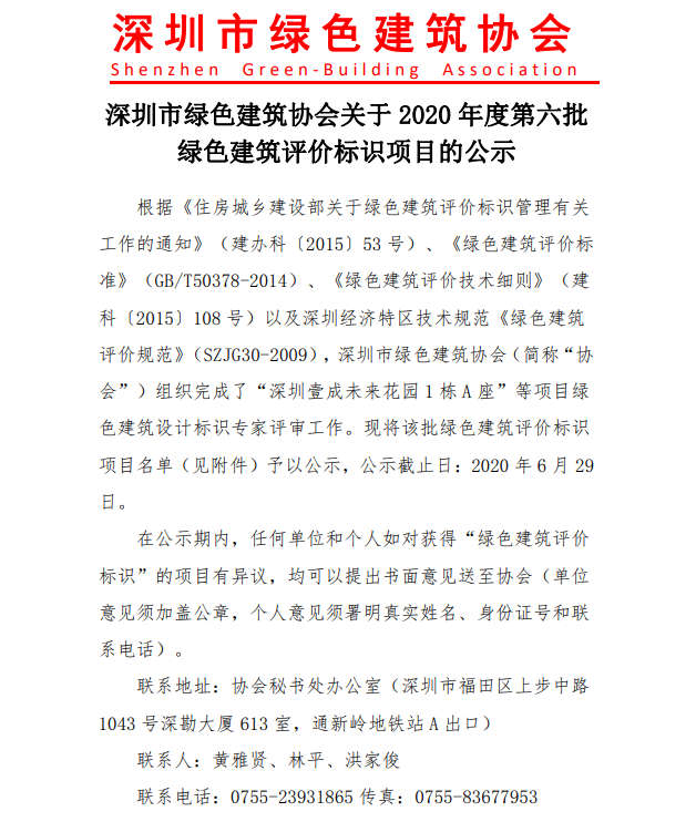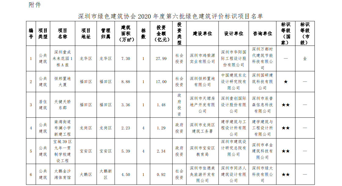 深圳市綠色建筑協(xié)會(huì)關(guān)于2020年度第六批綠色建筑設(shè)計(jì)階段評(píng)價(jià)標(biāo)識(shí)項(xiàng)目的公示