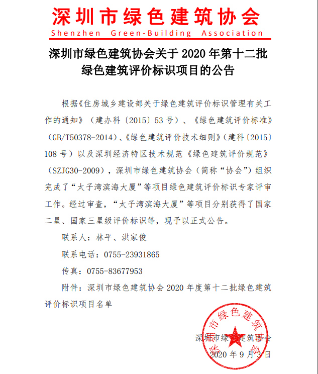 深圳市綠色建筑協(xié)會(huì)關(guān)于2020年度第十二批綠色建筑評(píng)價(jià)標(biāo)識(shí)項(xiàng)目的公告