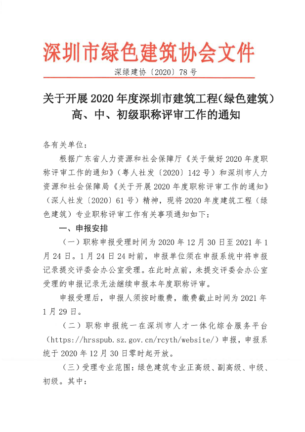 關(guān)于開展2020年度深圳市建筑工程(綠色建筑)高、中、初級職稱評審工作的通知