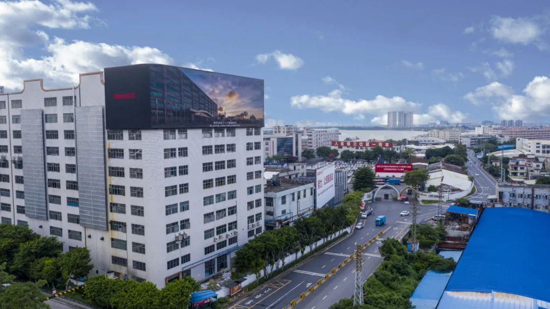 2020年9月,在格蘭仕順德總部,一棟大樓外圍頂部完成了最新的樓面設(shè)計,L型曲面巨型LED顯示屏全面點(diǎn)亮,奪目鮮艷的顯示畫面,為沉寂的工業(yè)區(qū)喚醒了新的生命力。