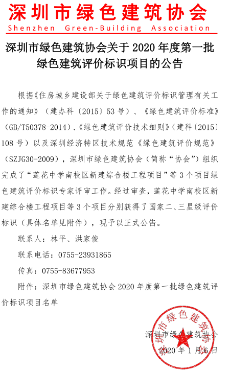 深圳市綠色建筑協(xié)會關(guān)于2020年度第一批綠色建筑評價標(biāo)識項目的公告