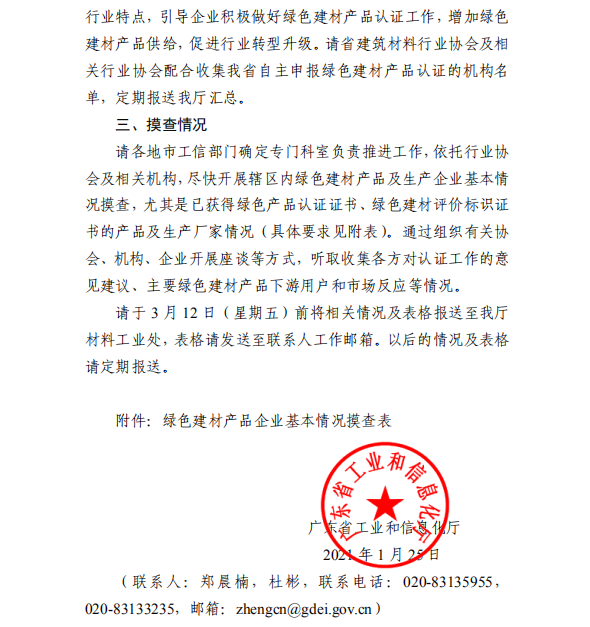 協(xié)會受深圳市工業(yè)和信息化局委托,現(xiàn)開展綠色建材產(chǎn)品及生產(chǎn)企業(yè)基本情況摸查工作,請各單位積極填寫《綠色建材產(chǎn)品企業(yè)基本情況摸查表》(附件),并于2021年3月5日前將表格發(fā)送至協(xié)會郵箱szlx003@vip.126.com,相關(guān)通知同步已發(fā)郵件,請留意查收及時(shí)反饋。