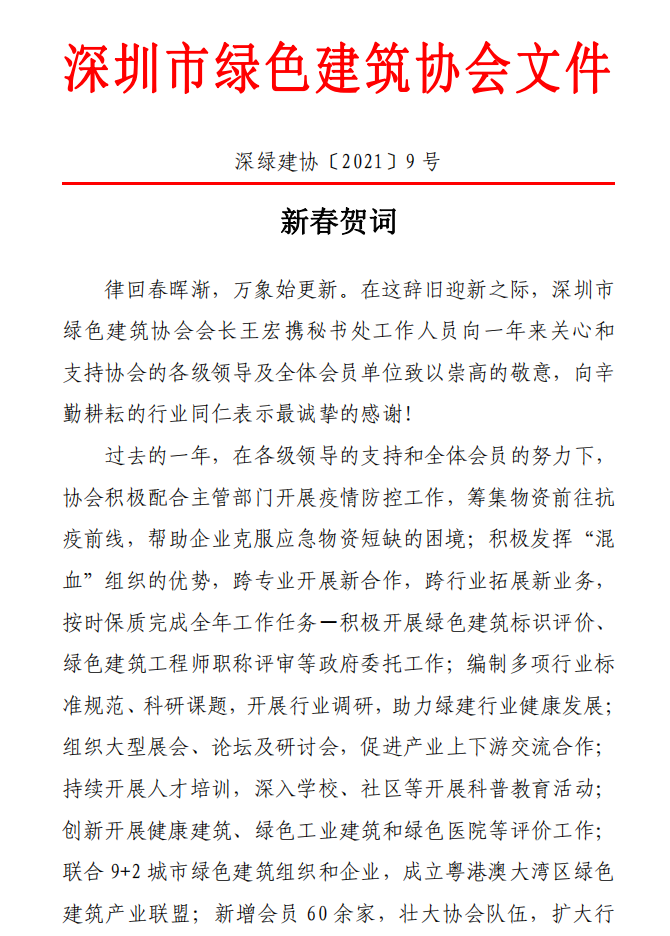 一元復(fù)始,萬象更新。攜手推動(dòng)綠色健康建筑的發(fā)展已成為全世界的共識(shí),打造綠色城市、建設(shè)美麗深圳,是我們始終為之努力踐行的方向。新的一年,讓我們以一往無前的奮斗姿態(tài)、風(fēng)雨無阻的精神狀態(tài),繼續(xù)開展深圳市綠色建筑的創(chuàng)新、交流與合作,推動(dòng)綠色建筑事業(yè)的健康發(fā)展。祝大家新春快樂,牛年大吉!