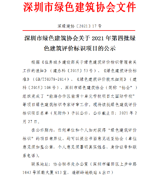 深圳市綠色建筑協(xié)會關(guān)于2021年第四批綠色建筑評價標(biāo)識項目的公示