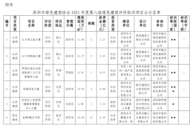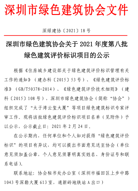 深圳市綠色建筑協(xié)會(huì)關(guān)于2021年第八批綠色建筑評(píng)價(jià)標(biāo)識(shí)項(xiàng)目的公示