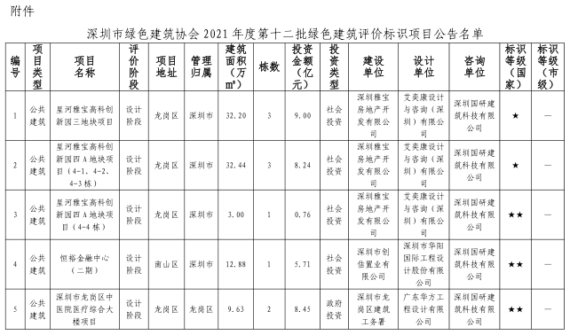 深圳市綠色建筑協(xié)會(huì)關(guān)于2021年第十二批綠色建筑評(píng)價(jià)標(biāo)識(shí)項(xiàng)目的公告