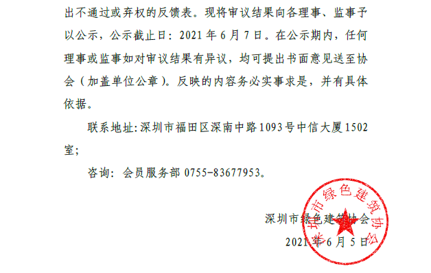 關(guān)于“深圳市綠色建筑協(xié)會(huì)第三屆理事會(huì)監(jiān)事會(huì)第九次工作會(huì)議(網(wǎng)上會(huì)議)”審議結(jié)果的公示