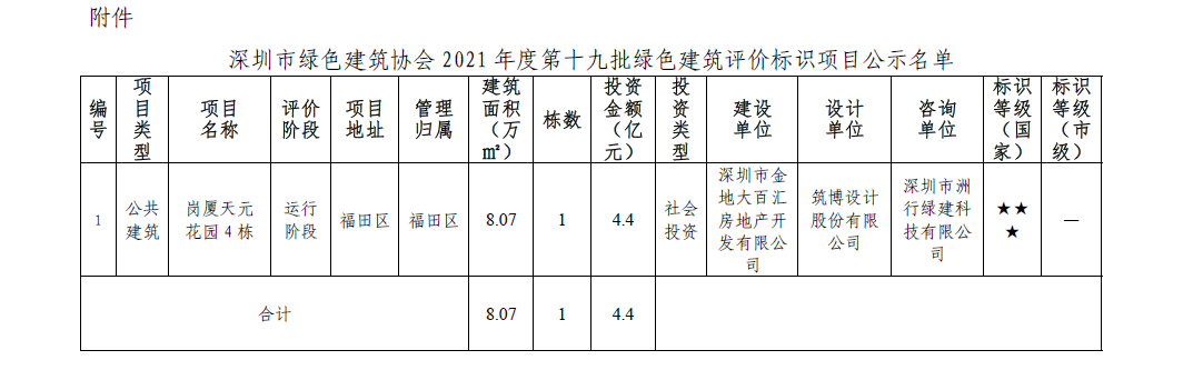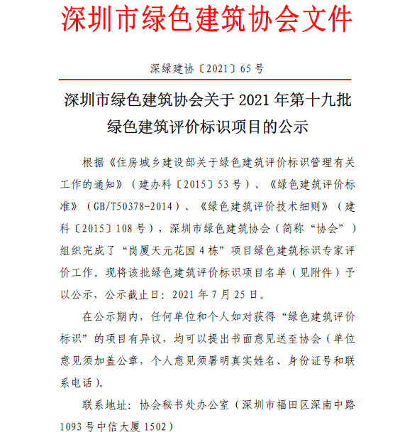 深圳市綠色建筑協(xié)會(huì)關(guān)于2021年第十九批綠色建筑評(píng)價(jià)標(biāo)識(shí)項(xiàng)目的公示
