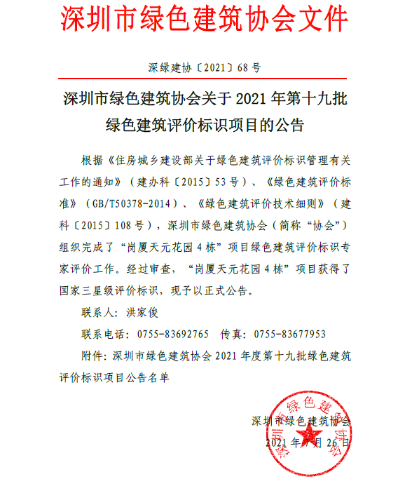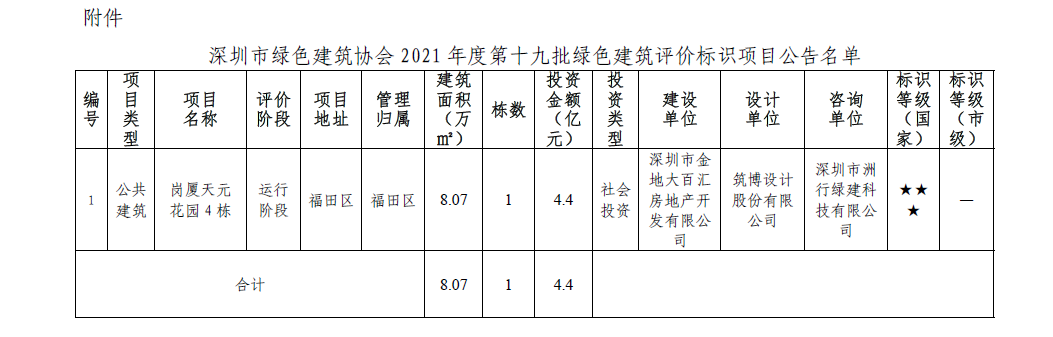 深圳市綠色建筑協(xié)會(huì)關(guān)于2021 年第十九批綠色建筑評(píng)價(jià)標(biāo)識(shí)項(xiàng)目的公告