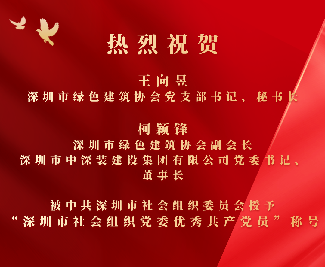 在慶祝中國(guó)共產(chǎn)黨成立100周年之際,為表彰先進(jìn)、樹(shù)立典型,營(yíng)造學(xué)習(xí)先進(jìn)、爭(zhēng)當(dāng)先進(jìn)、趕超先進(jìn)的濃厚氛圍,進(jìn)一步激發(fā)各級(jí)黨組織、廣大黨員的工作熱情,凝聚起建功新時(shí)代、奮進(jìn)新征程的磅礴力量,經(jīng)中共深圳市社會(huì)組織委員會(huì)研究決定,授予鄭衛(wèi)寧等90名同志“深圳市社會(huì)組織黨委優(yōu)秀共產(chǎn)黨員”稱號(hào),授予楊素賢等90名同志“深圳市社會(huì)組織黨委優(yōu)秀黨務(wù)工作者”稱號(hào),授予深圳市燃?xì)庑袠I(yè)黨委等50個(gè)基層黨組織“深圳市社會(huì)組織黨委先進(jìn)基層黨組織”稱號(hào),授予歐陽(yáng)祥山等10名同志“積極支持黨建工作社會(huì)組織負(fù)責(zé)人”稱號(hào)。深圳市綠色建筑協(xié)會(huì)黨支部書(shū)記王向昱、副會(huì)長(zhǎng)柯穎鋒榮獲“深圳市社會(huì)組織黨委優(yōu)秀共產(chǎn)黨員”稱號(hào)。