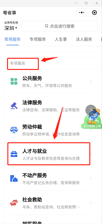 1、打開(kāi)微信粵省事小程序登錄后往下翻有個(gè)專項(xiàng)服務(wù)-人才與就業(yè)