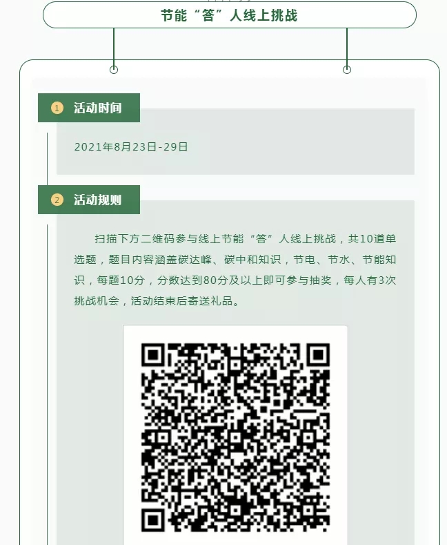為深入學習貫徹習近平新時代中國特色社會主義思想和黨的十九大精神,踐行習近平生態(tài)文明思想,完整、準確、全面貫徹新發(fā)展理念,廣泛開展節(jié)能降碳宣傳教育,大力倡導綠色低碳生產(chǎn)生活方式,在全社會營造節(jié)能低碳濃厚氛圍,促進經(jīng)濟社會發(fā)展全面綠色轉(zhuǎn)型,助力實現(xiàn)碳達峰、碳中和。經(jīng)國務院批準:全國節(jié)能宣傳周定為8月23日至8月29日;全國低碳日定為8月25日。全國節(jié)能宣傳周活動的主題是“節(jié)能降碳,綠色發(fā)展”;全國低碳日活動主題是“低碳生活,綠建未來”。