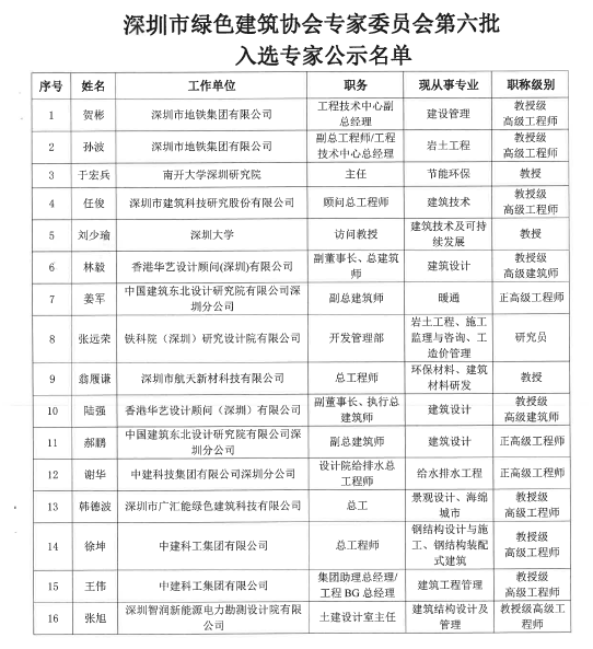 “深圳市綠色建筑協(xié)會專家委員會”第六批入選專家名單公示