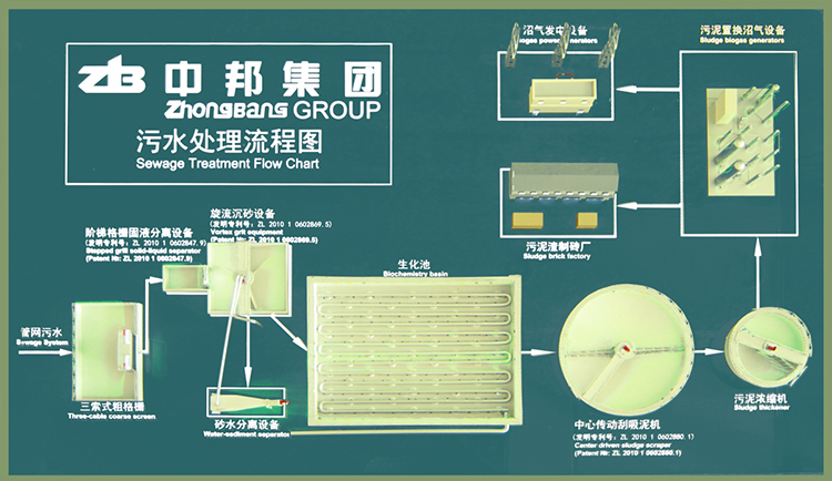 第一步、污水管網(wǎng)匯集至污水處理廠“集中池”內(nèi),“集中池”內(nèi)的“粗格柵”首先對(duì)污水進(jìn)行固液分離,將分離出來(lái)的固體物質(zhì)送至“垃圾集中處理場(chǎng)”進(jìn)行無(wú)害化處理。 第二步、經(jīng)過(guò)“粗格柵”處理后的污水由管道輸送至“砂水分離設(shè)備”,通過(guò)旋流沉砂原理使污水中的砂及有機(jī)雜物分離出來(lái),其中砂和有機(jī)雜物也送至“垃圾集中處理場(chǎng)”進(jìn)行無(wú)害化處理。 第三步、“砂水分離設(shè)備”處理過(guò)的污水通過(guò)管道再送至“生化池”,“生化池”內(nèi)安裝有足量的“曝氣設(shè)備”,通過(guò)“曝氣設(shè)備”分解污水中的有機(jī)物,使污水中的COD和BOD等達(dá)標(biāo)后,再通過(guò)管道送至“二沉池”處理。 第四步、“二沉池”內(nèi)安裝有不同型號(hào)的“刮泥機(jī)設(shè)備”,通過(guò)“刮泥機(jī)設(shè)備”使污水中的污泥慢慢沉入“二沉池”池底,沉入池底的污泥通過(guò)刮泥板刮到中心集泥坑,再?gòu)募嗫油ㄟ^(guò)污泥自身重力流至“濃縮池”,這時(shí)的污水已逐漸澄清。 第五步、“濃縮池”內(nèi)安裝有“加速沉淀設(shè)備”,使污泥加速沉淀,減少污泥中的含水量(原始污泥中的含水量大約為85%~90%),然后再輸送至“污泥壓濾設(shè)備”進(jìn)行壓濾,以進(jìn)一步減少污泥中的水含量。 第六步、經(jīng)濃縮過(guò)后的污泥送至高溫發(fā)酵池,期間產(chǎn)生的沼氣進(jìn)入“沼氣收集設(shè)備”,通過(guò) “沼氣收集設(shè)備”濃縮后,沼氣輸送至發(fā)電廠發(fā)電。 第七步、最后的污泥廢渣送至制磚廠供生產(chǎn)各種型號(hào)的磚制品。 通過(guò)以上七步工序,污水中的廢物得到100%的再生利用,污水處理全過(guò)程完全達(dá)到無(wú)害化處理的要求。