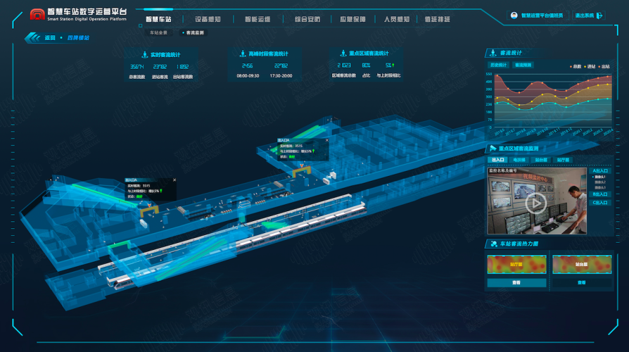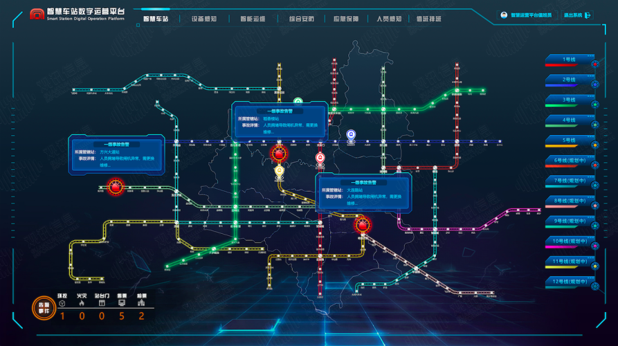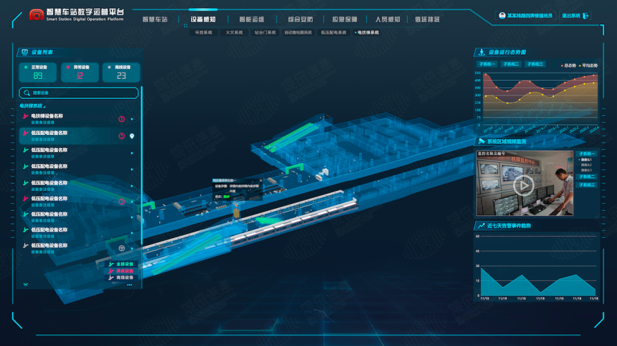 以觀訊信息自主研發(fā)的智慧車站三維綜合管理平臺(tái),以車站的BIM和GIS三維數(shù)據(jù)作為基礎(chǔ)數(shù)據(jù),與車站的各為聯(lián)網(wǎng)數(shù)據(jù)進(jìn)行基礎(chǔ),實(shí)現(xiàn)三維可視化的動(dòng)態(tài)管理。主要集成了視頻監(jiān)控系統(tǒng)、安檢系統(tǒng)、AFC系統(tǒng)、電梯控制系統(tǒng)、門禁系統(tǒng)、智慧消防系統(tǒng)、智能環(huán)控系統(tǒng)、能耗分析等系統(tǒng)。實(shí)現(xiàn)車站運(yùn)營對(duì)設(shè)備、環(huán)境、能耗、客人、安檢的實(shí)時(shí)監(jiān)測(cè)。