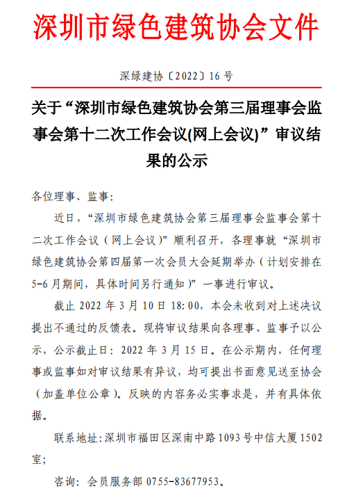 關(guān)于“深圳市綠色建筑協(xié)會第三屆理事會第十二次工作會議”審議結(jié)果的公示