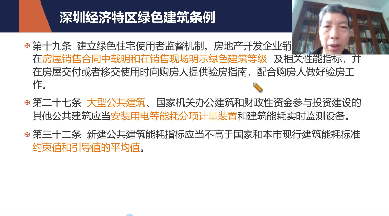 根據(jù)以上行業(yè)近期發(fā)展動態(tài)和專業(yè)技術人員的需求,兩場培訓內(nèi)容各有側重。第一場培訓主要圍繞“深圳市綠色建筑行業(yè)動態(tài)及相關政策介紹、建筑業(yè)企業(yè)及項目碳排放核算與碳交易”;第二場培訓就“綠色建筑星級評價、預評價、近零能耗建筑、綠色校園等標準申報要點及注意事項”等內(nèi)容進行講解。疫情背景下,兩場活動均安排“高星級綠色建筑項目線上觀摩”環(huán)節(jié),讓學員足不出戶即可學習優(yōu)秀項目的先進經(jīng)驗。