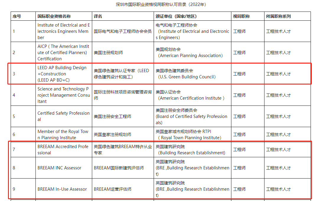 《目錄》中涉及到LEED AP、BREEAM AP、BREEAM INC Assessor、BREEAM In-Use Assessor等與綠色建筑相關的國際職稱,均可視為工程類中級職稱。