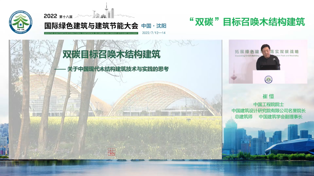 圍繞“木結構建筑”和“雙碳戰(zhàn)略”兩個關鍵詞,崔愷院士在他的主旨報告中梳理了當前我國發(fā)展木結構的相關政策及標準規(guī)范,并指出木結構建筑在全生命周期的能耗和環(huán)境影響遠優(yōu)于鋼結構和混凝土結構,具有固碳、生產運輸能耗少、保溫性能佳、預制便捷、壽命長和可回收利用等優(yōu)點。他表示,隨著我國雙碳戰(zhàn)略目標的出臺,使得綠色環(huán)保的現(xiàn)代木結構建筑將會獲得更積極的重視和推廣,同時伴隨著生物源材料的廣泛使用、生物氣候設計和可再生能源的生產相結合,勢必將推動可持續(xù)發(fā)展的生態(tài)轉型邁入新階段。