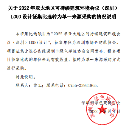 關(guān)于 2022 年亞太地區(qū)可持續(xù)建筑環(huán)境會(huì)議(深圳) LOGO 設(shè)計(jì)征集比選轉(zhuǎn)為單一來(lái)源采購(gòu)的情況說(shuō)明