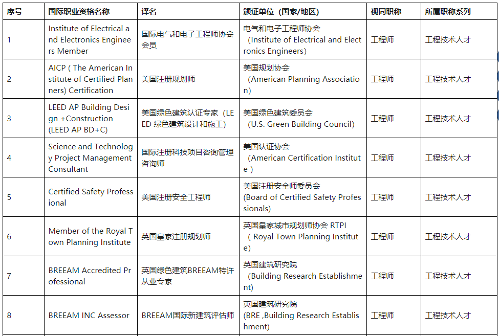 《目錄》指出,LEED AP、BREEAM AP、BREEAM INC Assessor、BREEAM In-Use Assessor、香港注冊建筑師、香港注冊專業(yè)工程師、香港注冊專業(yè)規(guī)劃師等國際職業(yè)資質(zhì)(詳見附表),均可視為工程類中級職稱。如滿足學(xué)歷資歷等要求,可直接申報(bào)副高級工程師職稱。
