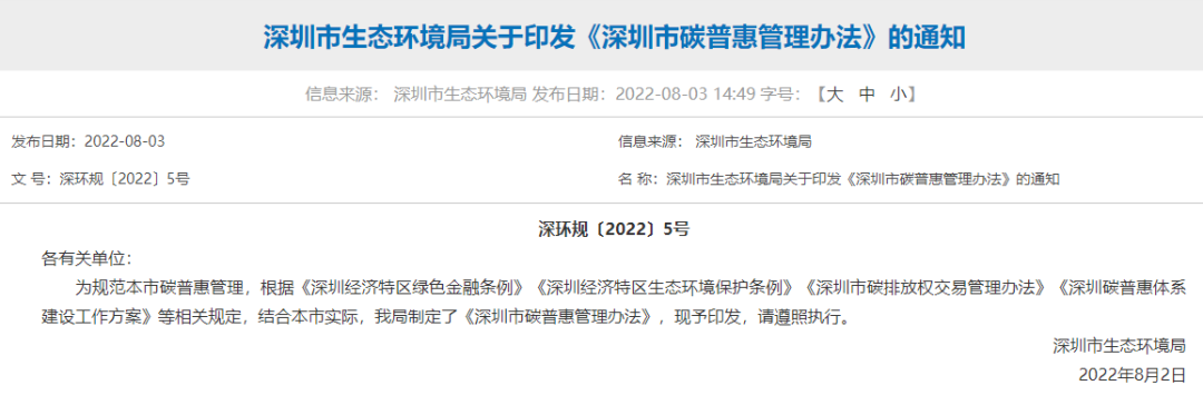 深圳市生態(tài)環(huán)境局關于印發(fā)《深圳市碳普惠管理辦法》的通知