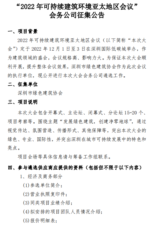 “2022 年可持續(xù)建筑環(huán)境亞太地區(qū)會議” 會務(wù)公司征集公告