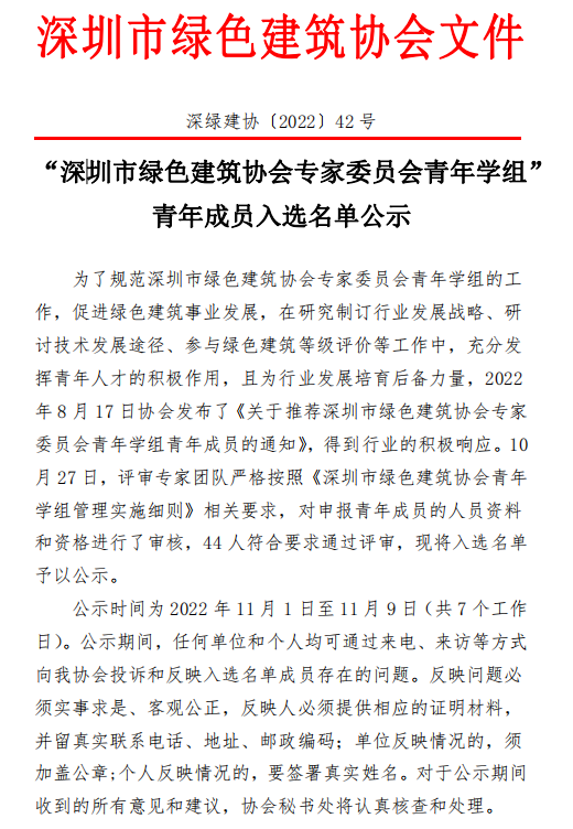 “深圳市綠色建筑協(xié)會專家委員會青年學(xué)組”青年成員入選名單公示