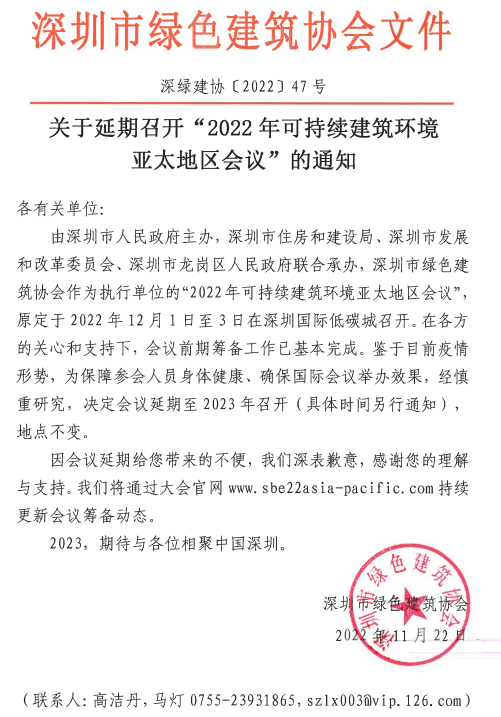 關(guān)于延期召開(kāi)“2022年可持續(xù)建筑環(huán)境亞太地區(qū)會(huì)議”的通知