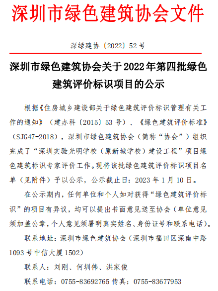 深圳市綠色建筑協(xié)會(huì)關(guān)于2022年第四批綠色建筑評(píng)價(jià)標(biāo)識(shí)項(xiàng)目的公示