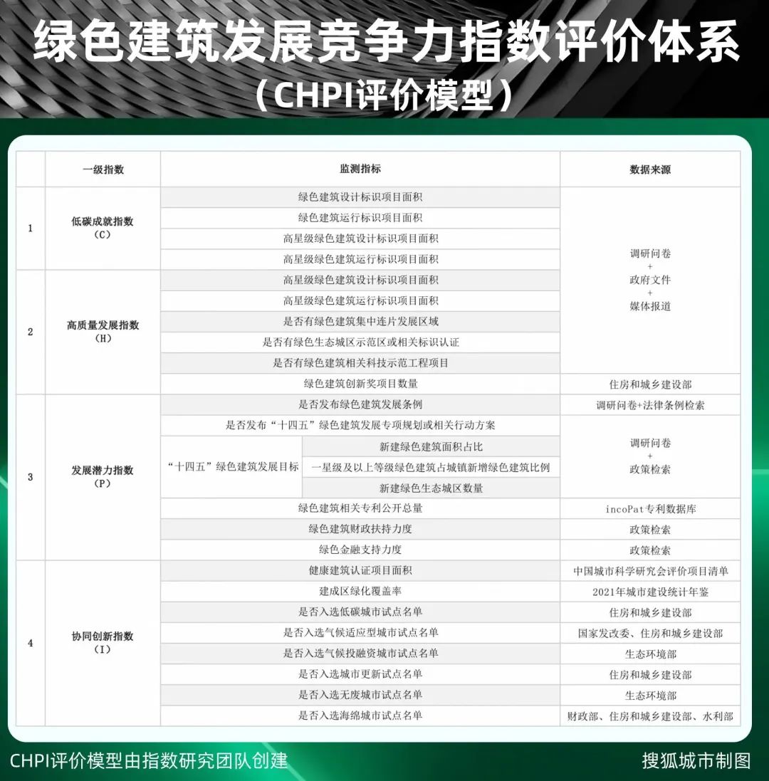 2021年,搜狐城市聯(lián)合中國城市科學研究會、北京清華同衡規(guī)劃設(shè)計研究院,共同創(chuàng)建“中國城市綠色建筑發(fā)展競爭力指數(shù)評價體系”,并聯(lián)合發(fā)布了《2021中國城市綠色建筑發(fā)展競爭力指數(shù)報告》。今年的“中國城市綠色建筑發(fā)展競爭力指數(shù)評價體系”主要包含以下4項一級指數(shù):低碳成就指數(shù)、高質(zhì)量發(fā)展指數(shù)、發(fā)展?jié)摿χ笖?shù)、協(xié)同創(chuàng)新指數(shù),每項指數(shù)均包含相應(yīng)的監(jiān)測指標。