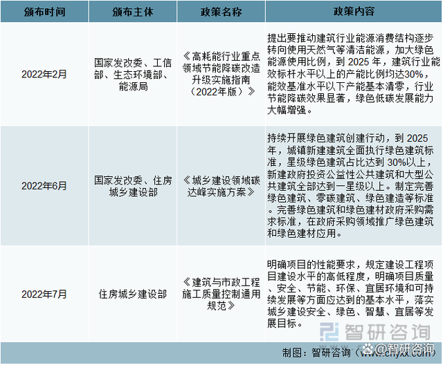 2017-2022年期間,國務(wù)院、國家發(fā)改委、住房城鄉(xiāng)建設(shè)部、工信部、生態(tài)環(huán)境部、能源局等多部門都陸續(xù)印發(fā)了支持綠色建筑行業(yè)的發(fā)展政策和指導(dǎo)意見,包括《關(guān)于促進建筑業(yè)持續(xù)健康發(fā)展的意見》、《綠色建筑創(chuàng)建行動方案》、《綠色建筑標識管理辦法》、《關(guān)于加快建立健全綠色低碳循環(huán)發(fā)展經(jīng)濟體系的指導(dǎo)意見》、《城鄉(xiāng)建設(shè)領(lǐng)域碳達峰實施方案》等。