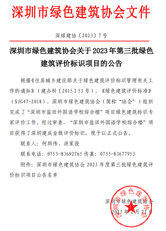深圳市綠色建筑協(xié)會關(guān)于2023年第三批綠色建筑評價標(biāo)識項(xiàng)目的公告