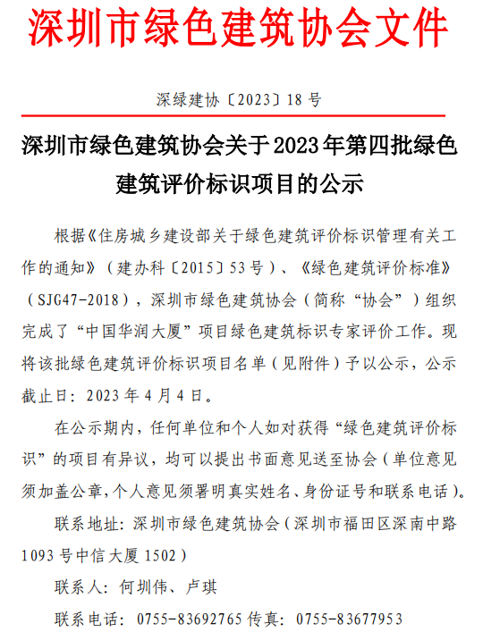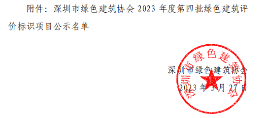 深圳市綠色建筑協(xié)會(huì)關(guān)于2023年第四批綠色建筑評(píng)價(jià)標(biāo)識(shí)項(xiàng)目的公示