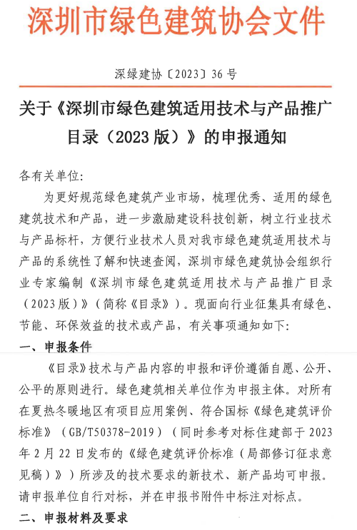 關(guān)于《深圳市綠色建筑適用技術(shù)與產(chǎn)品推廣目錄(2023版)》的申報(bào)通知