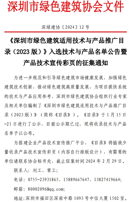 《深圳市綠色建筑適用技術(shù)與產(chǎn)品推廣目錄(2023版)》入選技術(shù)與產(chǎn)品名單公告暨產(chǎn)品技術(shù)宣傳彩頁(yè)的征集通知