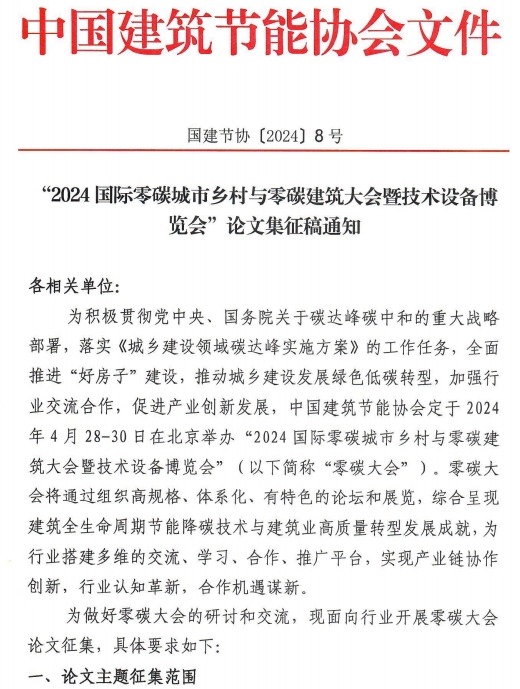 近日,中國(guó)建筑節(jié)能協(xié)會(huì)發(fā)布《關(guān)于召開(kāi)“2024國(guó)際零碳城市鄉(xiāng)村與零碳大會(huì)暨技術(shù)設(shè)備博覽會(huì)”的通知》(簡(jiǎn)稱《通知》)。《通知》指出,2024國(guó)際零碳城市鄉(xiāng)村與零碳大會(huì)暨技術(shù)設(shè)備博覽會(huì)定于2024年4月28-30日在北京召開(kāi),主題為“推動(dòng)建筑零碳發(fā)展,促進(jìn)城鄉(xiāng)綠色低碳轉(zhuǎn)型”。