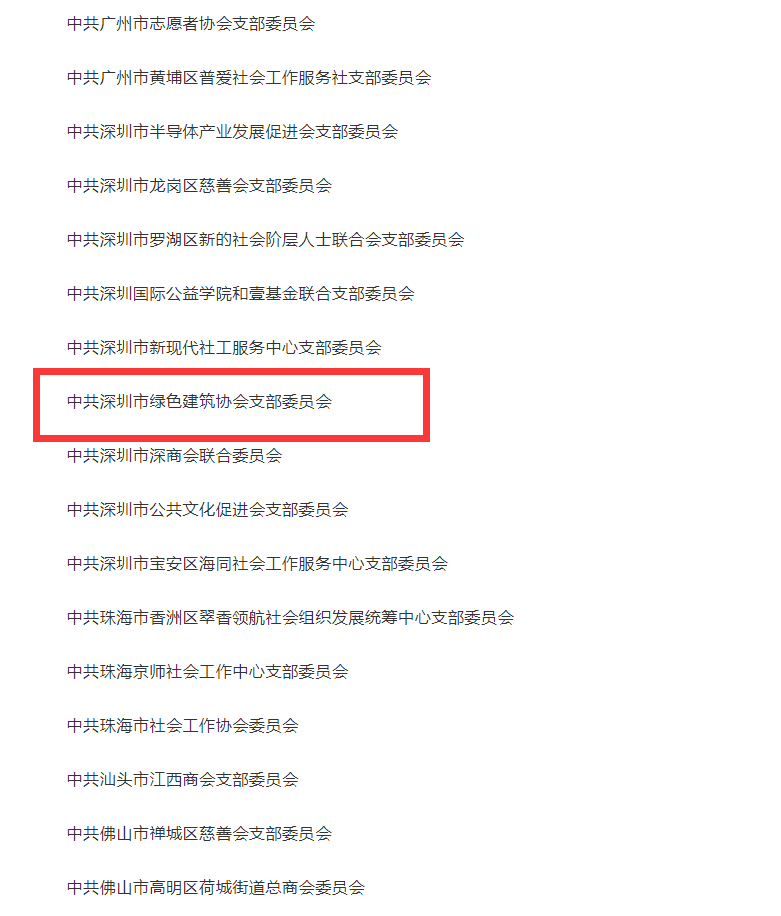 2023年12月29日,中共廣東省社會(huì)組織委員會(huì)印發(fā)文件,對(duì)第二批廣東省社會(huì)組織黨建工作示范點(diǎn)單位(共67家)進(jìn)行公示。深圳市綠色建筑協(xié)會(huì)黨支部憑借優(yōu)異的工作成果、嚴(yán)謹(jǐn)務(wù)實(shí)的工作作風(fēng)脫穎而出,入選第二批廣東省社會(huì)組織黨建工作示范點(diǎn)單位。