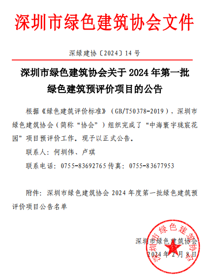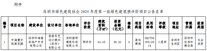 深圳市綠色建筑協(xié)會(huì)關(guān)于2024年第一批綠色建筑預(yù)評(píng)價(jià)項(xiàng)目的公告