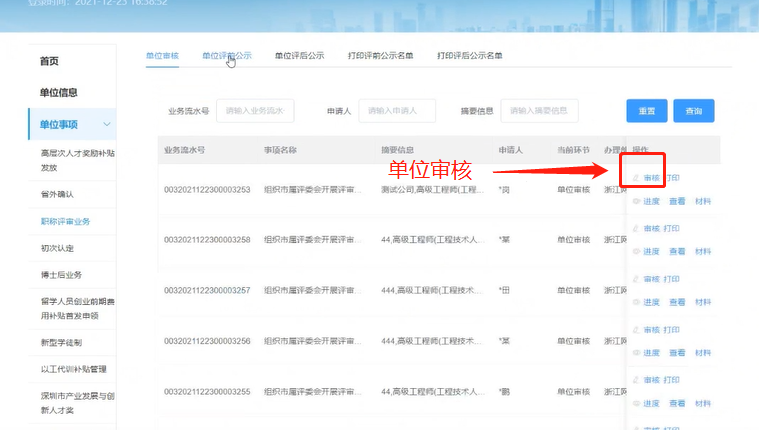 四、點(diǎn)擊“單位審核-審核”,查看申報(bào)人材料