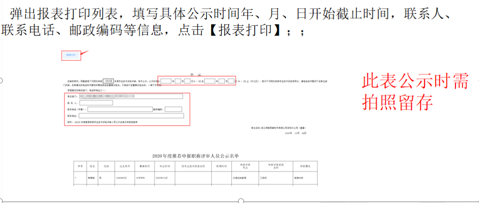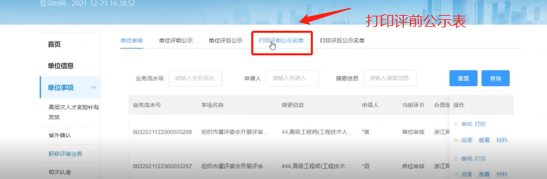 七、上傳單位承諾書(shū)及審核完成信息后,審核提交選擇業(yè)務(wù):報(bào)送去向及報(bào)送單位。提交后,業(yè)務(wù)將繼續(xù)在單位進(jìn)行評(píng)前公示環(huán)節(jié),打印評(píng)前公示表。(備注:公示日期不少于5個(gè)工作日)